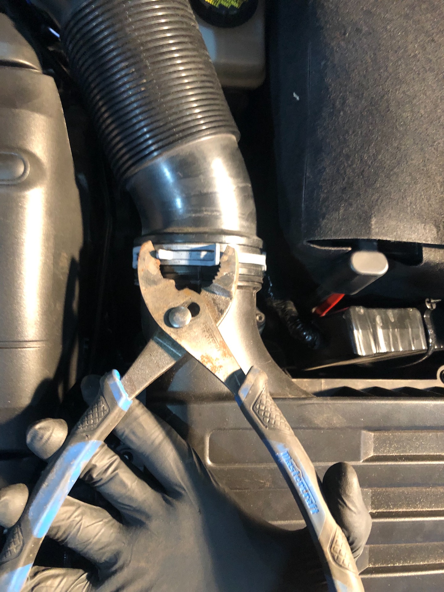 Disconnect the intake pipe from the box by using a pair of pliers to loosen the clamp and slide out the intake box